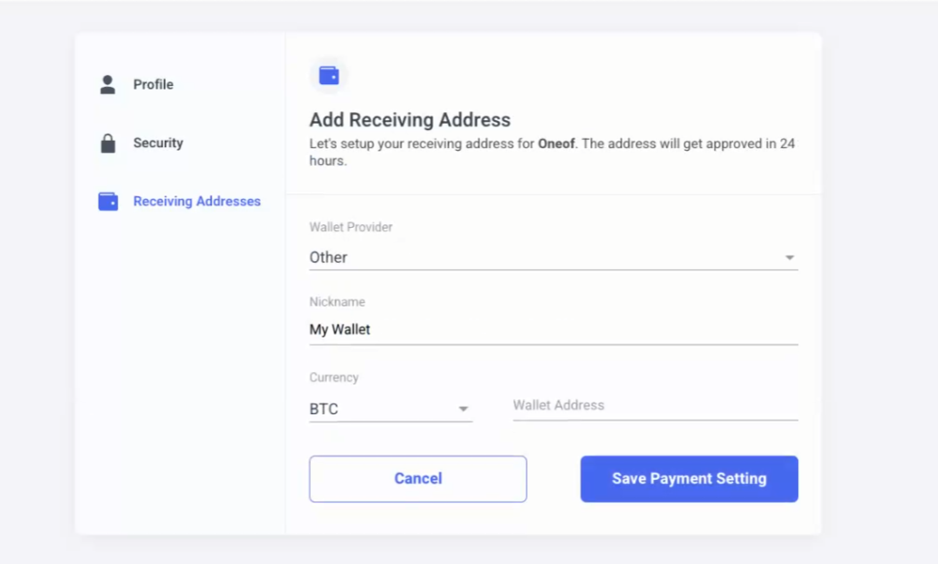 7. You'll then need to setup your receiving wallet by going to Settings Page > Receiving Addresses. You will see a message, OneOf wants to send you a payment, Click Setup to start this process.